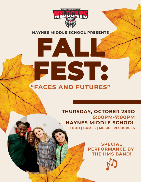 Haynes Middle School is hosting Fall Fest: “Faces and Futures” on Thursday, October 23rd, from 5:00–7:00 PM! This family-friendly evening will feature games, activities, food, music, and a Trunk or Treat. We’re looking for enthusiastic volunteers to help bring the celebration to life!