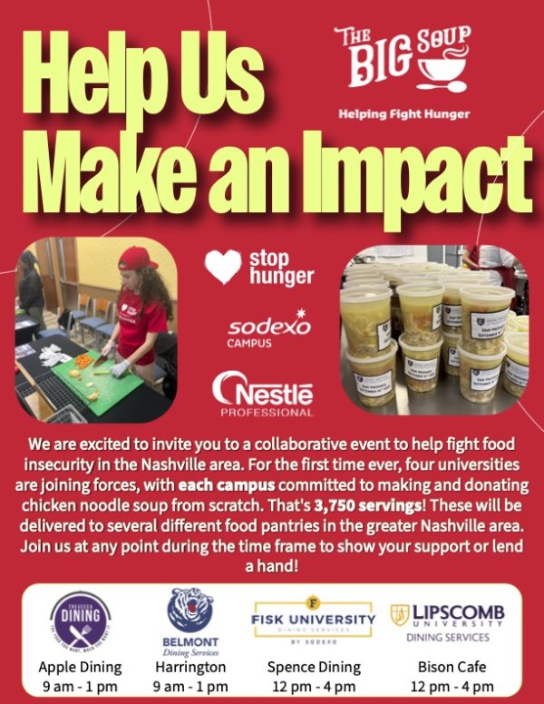 Belmont's Sodexo invites you to a collaborative event to help fight food insecurity in the Nashville area. For the first time ever, four universities are joining forces, with each campus committed to making and donating chicken noodle soup - totaling 3,750 servings! Soup will be delivered to several food pantries in the greater Nashville area.