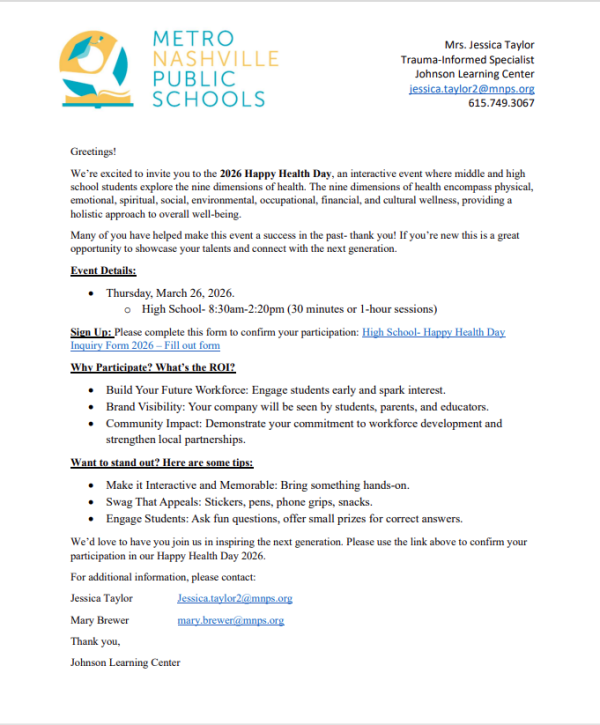 At Johnson ALC we are hosting a Happy Health Day event on March 26, 2026, from 8:30 AM to 2:20 PM. We will be rotating the students through sessions, and we would greatly appreciate it if you could lead a group session incorporating a focus on one of the 9 Dimensions of Wellness (cultural, financial, environmental, spiritual, occupational, social, intellectual, emotional, and physical).